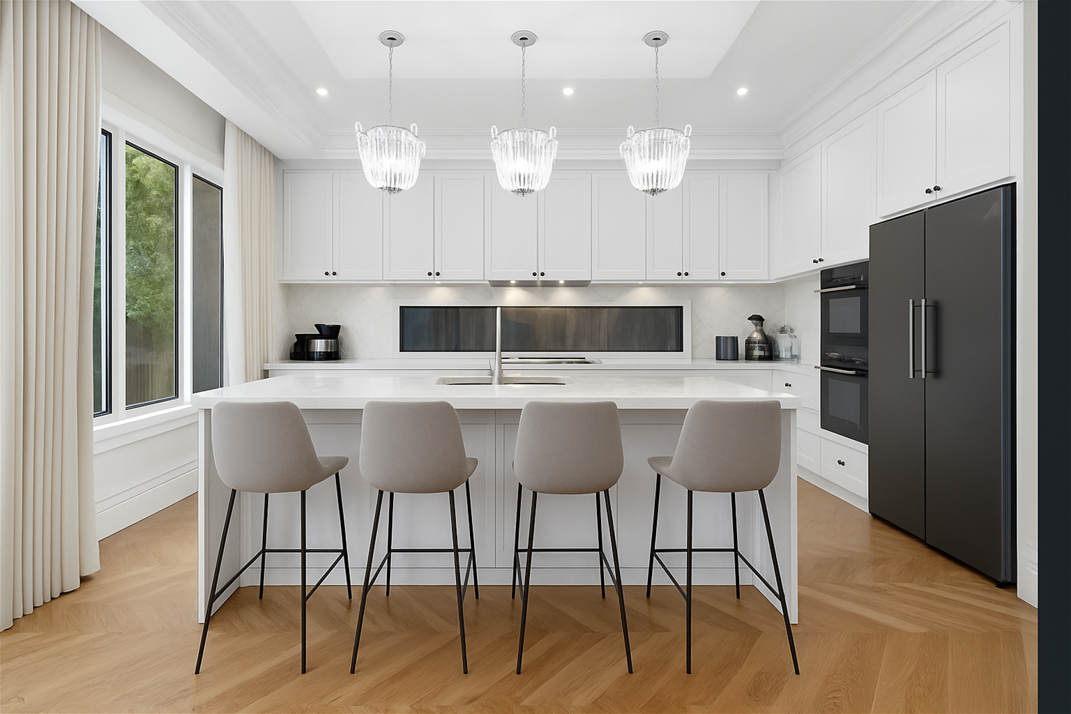 Chef-inspired kitchen featuring stunning 40 mm stone benchtops, a show-stopping waterfall island, and whisper-quiet soft-close cabinetry